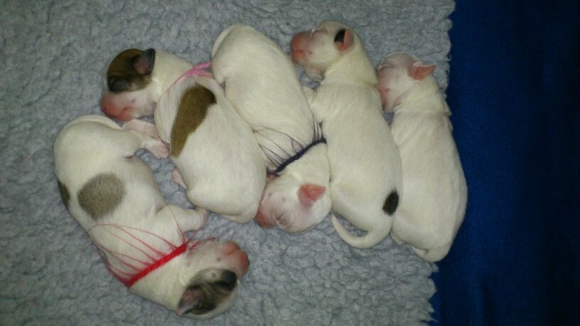 Born: 14.4-2013 3 females and 1 male 1 white female 245 gram 1 white male 225 gram 1 white female with color on ears and 3 spots on back 215 gram 1 white female with color on ears 245 gram The female belongs to kennel Sejer-Milland in Denmark by Aage Sejer Milland. More info: www.sejer-milland.dk |