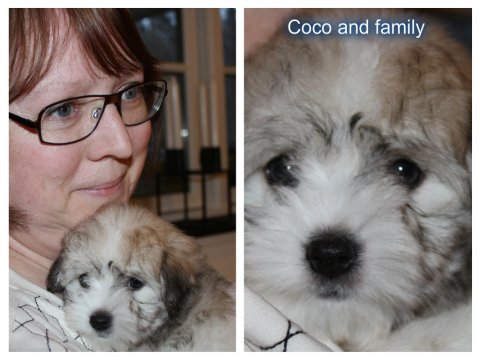 Coco er en sund og tillidsfuld hvalp, som hurtigt er faldet til i vores familie. Om morgenen trisser hun efter mig, når vi er rundt og vække familien. Og hver morgen et familiemedlem står ud af sengen er hun vildt begejstret. Hun er en glad og mild hund, som har charmeret os alle og vi glæder os til mange gode oplevelser fremover med hende i familien.